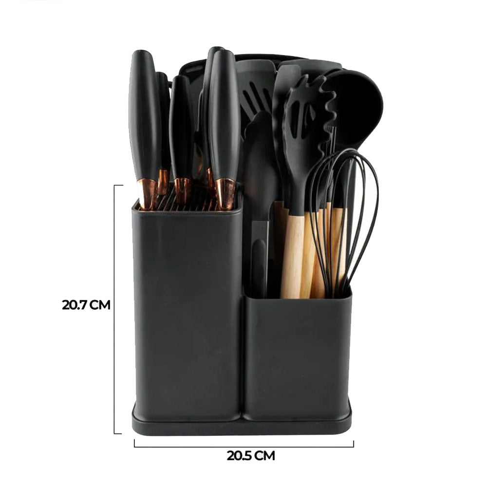Mantén tu cocina ordenada y con estilo con este organizador de utensilios multifuncional. Su diseño moderno combina elegancia y practicidad, ideal para cocinas contemporáneas. Incluye múltiples compartimentos para almacenar cuchillos, cucharones, espátulas, batidores y más.